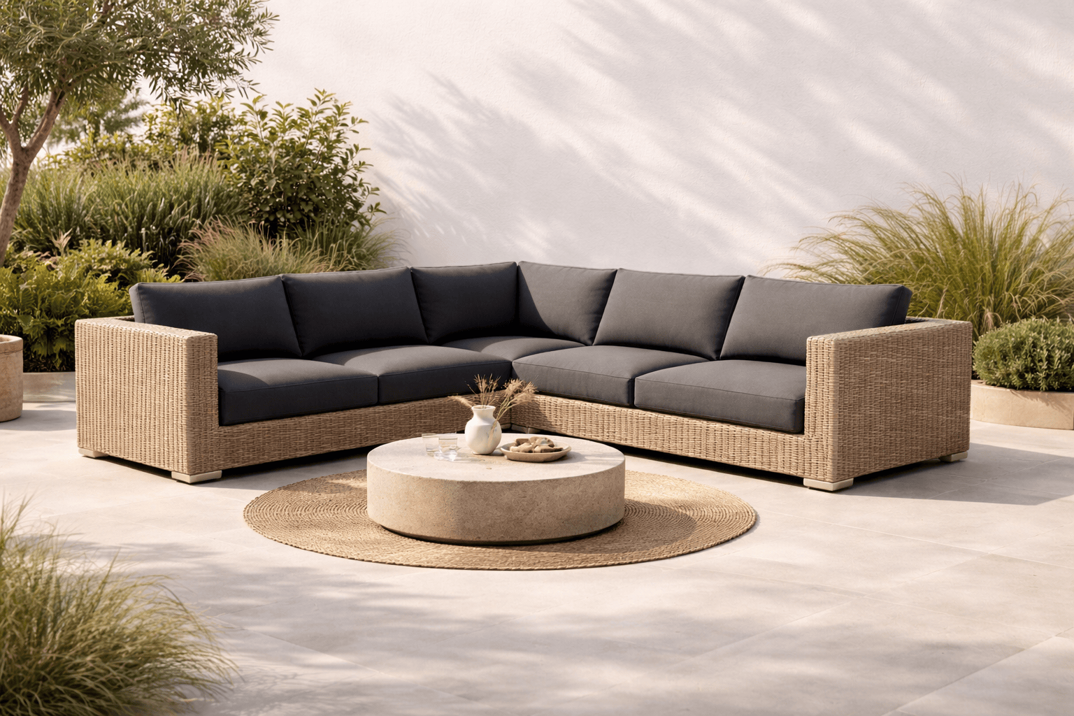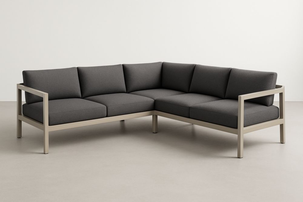 Structure en L, cadre solide et coussins épais offrant un bon confort, adapté aux jardins et terrasses pour un usage extérieur.