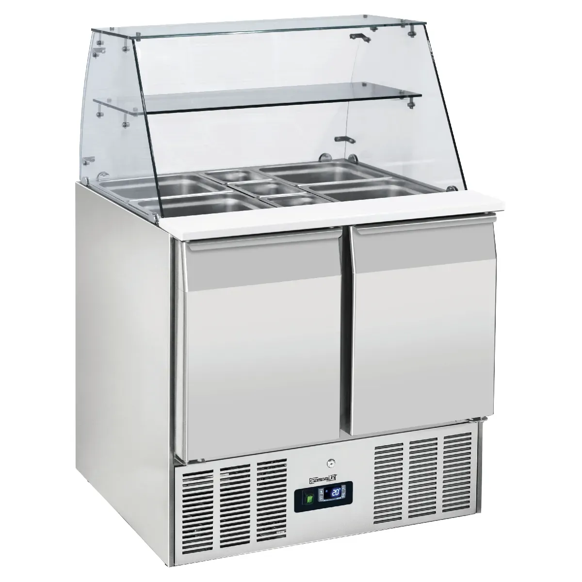 Pensée pour le service au comptoir, cette vitrine réfrigérée offre une présentation claire des ingrédients tout en maintenant une Température stable de +0 °C à +8 °C. La structure en acier inoxydable avec vitre de protection et étagère en verre facilite l'hygiène et la visibilité. Grâce au thermostat digital et au dégivrage automatique par cycle de compresseur, les réglages sont précis et l'entretien réduit. Le plan de travail à 840 mm de hauteur accompagne les gestes du quotidien, tandis que les deux portes à fermeture automatique sécurisent le froid lors des pics de préparation.